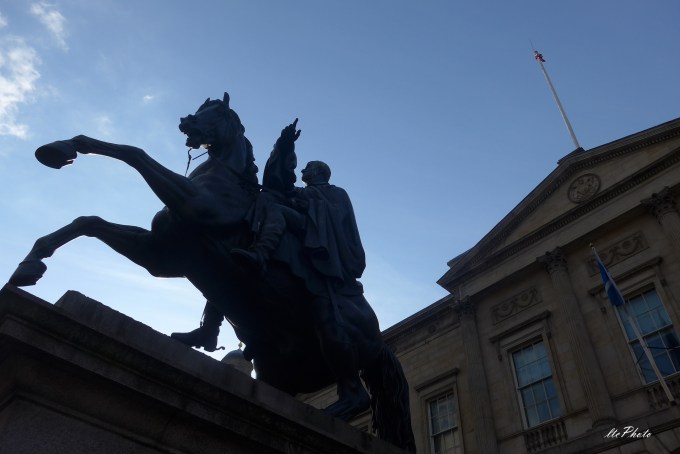 days. We used to go to the popular places and try to living in the same way of the inhabitants. So, in this beautiful and interesting town we was living during ten unforgettable days. We took a little nice studio in the center of the New Town, in West End, and every day we normally went to a previously selected place. One day, we was walking along of Princess Street, and suddenly there was staying, in front of us, the magnificent statue of The Duke of Wellington on a rearing horse. It is a very special monument which has difficulties for be hidden, as it attracts the attention of everybody. This monument, whose unveiling was celebrated in 1852, is a work of the sculptor Sir John Steel (1804-1891). We liked very much the place where it is sitting, in the most important and central artery, the Princess Street, just next and in front of the one of the most interesting buildings of the city, the Register House.